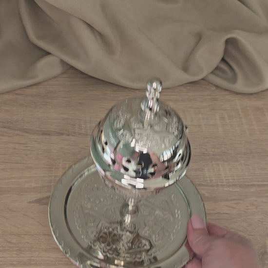 Porte encens oriental en métal argenté gravé, Lalla Fadma